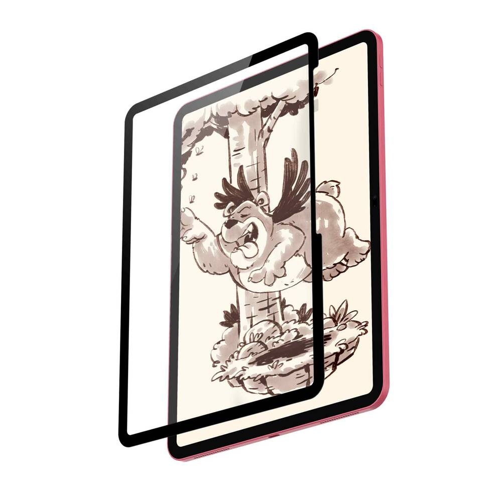 2. Usuń folię zabezpieczającą i umieść PaperTech na iPadzie, matową stroną do góry i wycięciem nad obszarem przedniego aparatu. Umieść go na iPadzie, a następnie delikatnie naciśnij czarną ramkę, aby zabezpieczyć go na miejscu. |